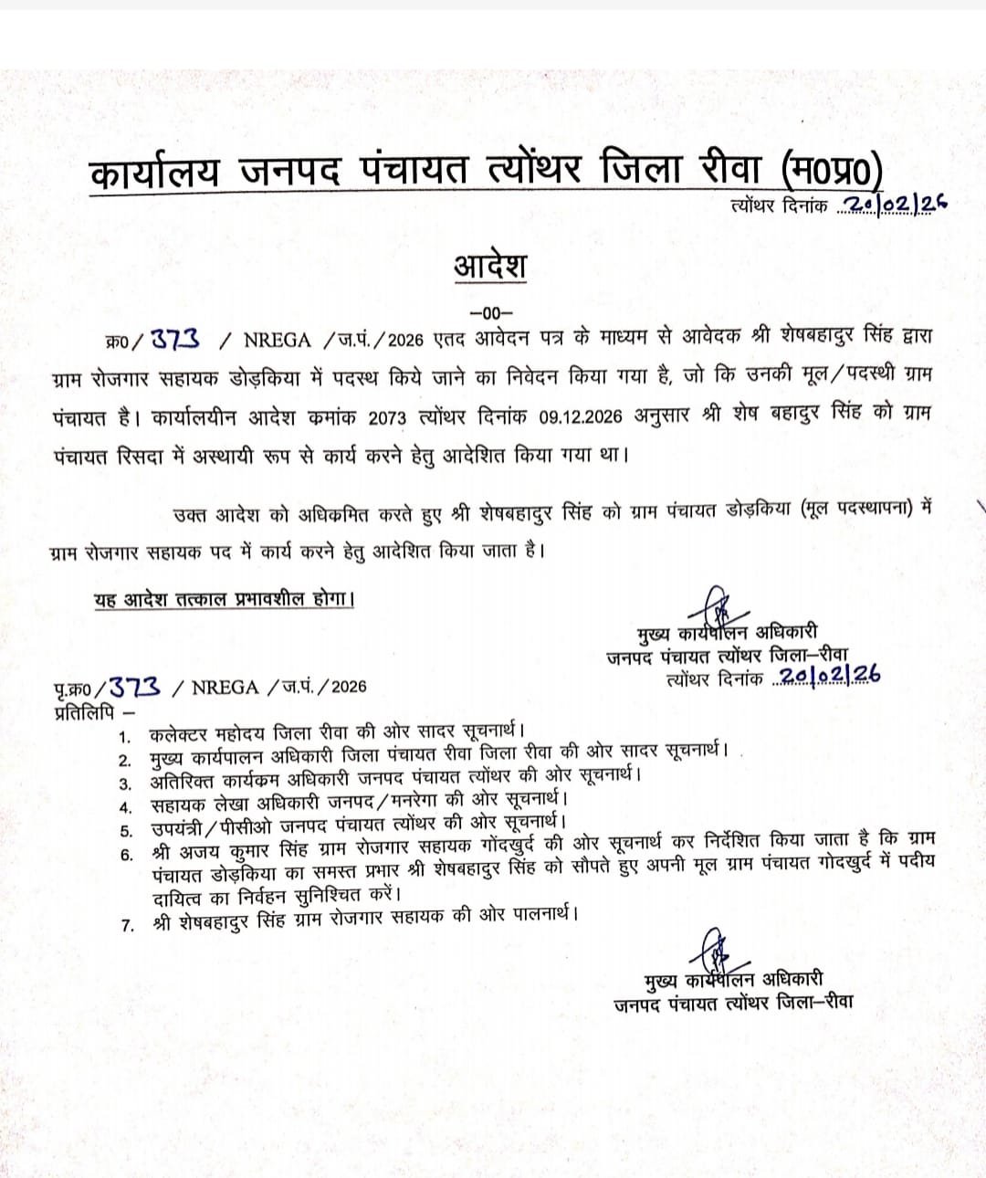 *“फरवरी में आदेश, दिसंबर की तारीख! डोडकिया पंचायत में ‘भविष्यवक्ता’ बन गए साहब?” आदेश पत्र सोशल मीडिया पर वायरल* रीवा जिले की त्योंथर जनपद पंचायत अंतर्गत डोडकिया ग्राम पंचायत में प्रशासनिक कार्यप्रणाली पर गंभीर सवाल खड़े हो गए हैं।ग्राम पंचायत में विवादित रोजगार सहायक शेष बहादुर सिंह पर त्यौंथर जनपद के सीईओ प्रवीण बांसोड की कथित मेहरबानी अब खुलेआम चर्चा का विषय बन चुकी है।20 फरवरी 2026 में जारी बताए जा रहे कार्यलीन आदेश क्रमांक 2073 पत्र में 9 दिसंबर 2026 की तारीख दर्ज कर दी गई। सवाल यह है कि क्या अधिकारी अब भविष्य भी देखने लगे हैं? या फिर यह किसी सुनियोजित खेल की पटकथा है? आदेश पत्र के सोशल मीडिया पर वायरल होते ही पंचायत से लेकर जनपद कार्यालय तक हड़कंप मच गया है। स्थानीय लोगों का आरोप है कि यह महज टंकण त्रुटि नहीं, बल्कि संरक्षण की पराकाष्ठा है। पहले से विवादों में रहे रोजगार सहायक को बचाने के लिए क्या नियम-कायदों को ताक पर रख दिया गया? जनता पूछ रही है — क्या प्रशासन में तारीखें भी सुविधा अनुसार तय होने लगी हैं? क्या जिम्मेदार अफसर इस “भविष्य की तारीख” का खुलासा करेंगे? डोडकिया पंचायत का यह मामला अब सिर्फ एक आदेश पत्र की गलती नहीं, बल्कि पूरी व्यवस्था की पारदर्शिता पर सवाल बन चुका है। यदि समय रहते जांच नहीं हुई तो यह प्रकरण प्रशासनिक विश्वसनीयता पर गहरा दाग साबित हो सकता है।