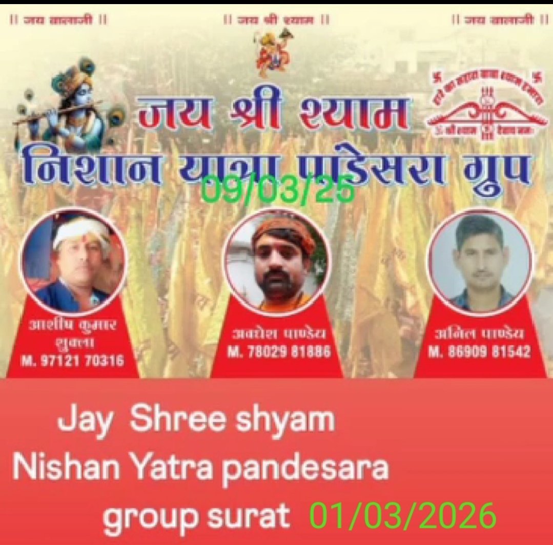 गुजरात प्रदेश सुरत शहर के पांडेसरा विस्तार पुलिस कॉलोनी गणेश नगर के सामने से निशान यात्रा का आयोजन आयोजक ने किया श्याम भक्तों से अनुरोध