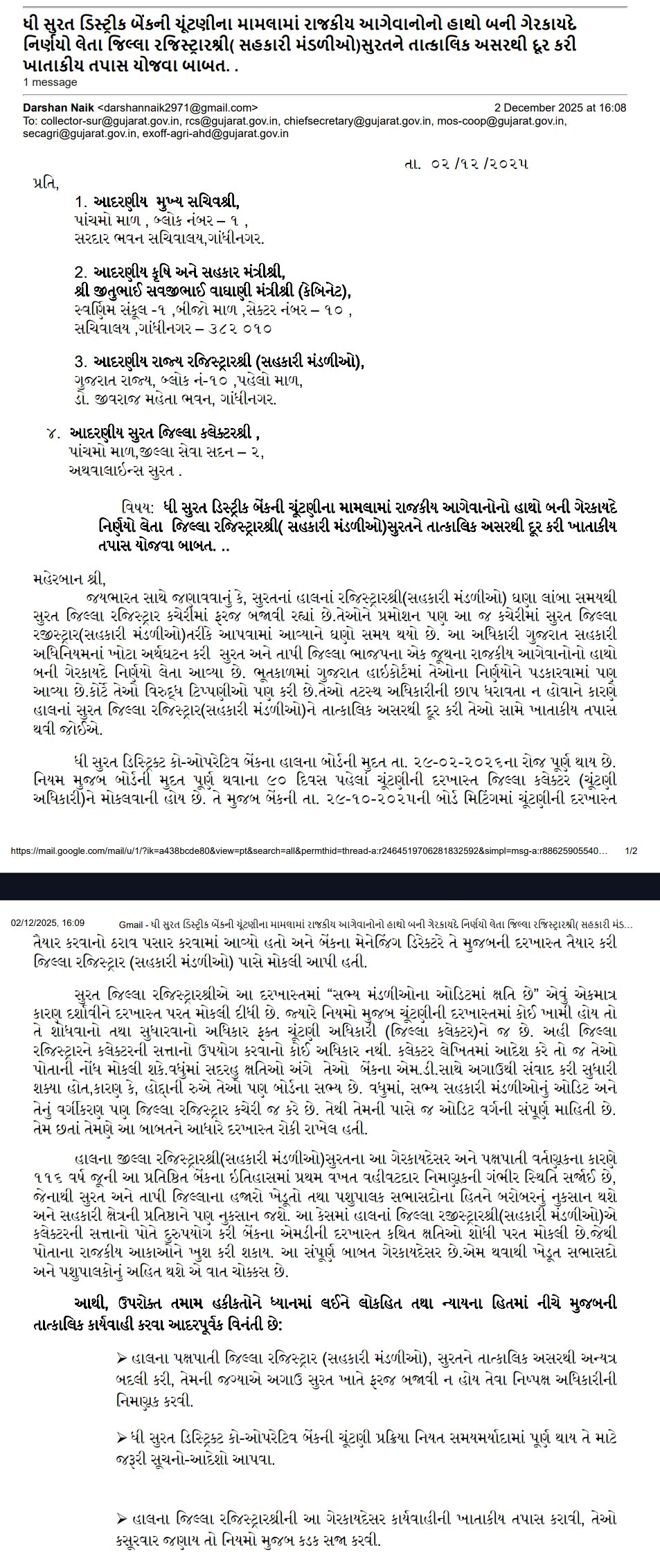 द सूरत डिस्ट्रिक्ट को-ऑपरेटिव बैंक की चुनाव प्रक्रिया में राजनीतिक नेताओं के इशारे पर अवैध निर्णय लेने वाले जिला रजिस्ट्रार (सहकारी संस्थाएं), सूरत को तत्काल प्रभाव से हटाने तथा उनके विरुद्ध विभागीय जांच कराने बाबत।