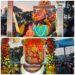 कोसीकलां। शारदीय नवरात्रि के पावन अवसर पर तृतीय दिवस को मां चंद्रघंटा की भव्य एवं दिव्य झांकियां ग्यालाल स्मृति भवन से प्रारंभ होकर नगर में श्रद्धा, भक्ति और उल्लास के साथ धूमधाम से निकाली गई। मां चंद्रघंटा की सुसज्जित एवं आकर्षक झांकी के साथ-साथ विभिन्न देवी-देवताओं, पौराणिक प्रसंगों एवं सांस्कृतिक विषयों पर आधारित अनेक मनमोहक झांकियां शामिल रहीं, जिन्होंने उपस्थित श्रद्धालुओं का मन मोह लिया।